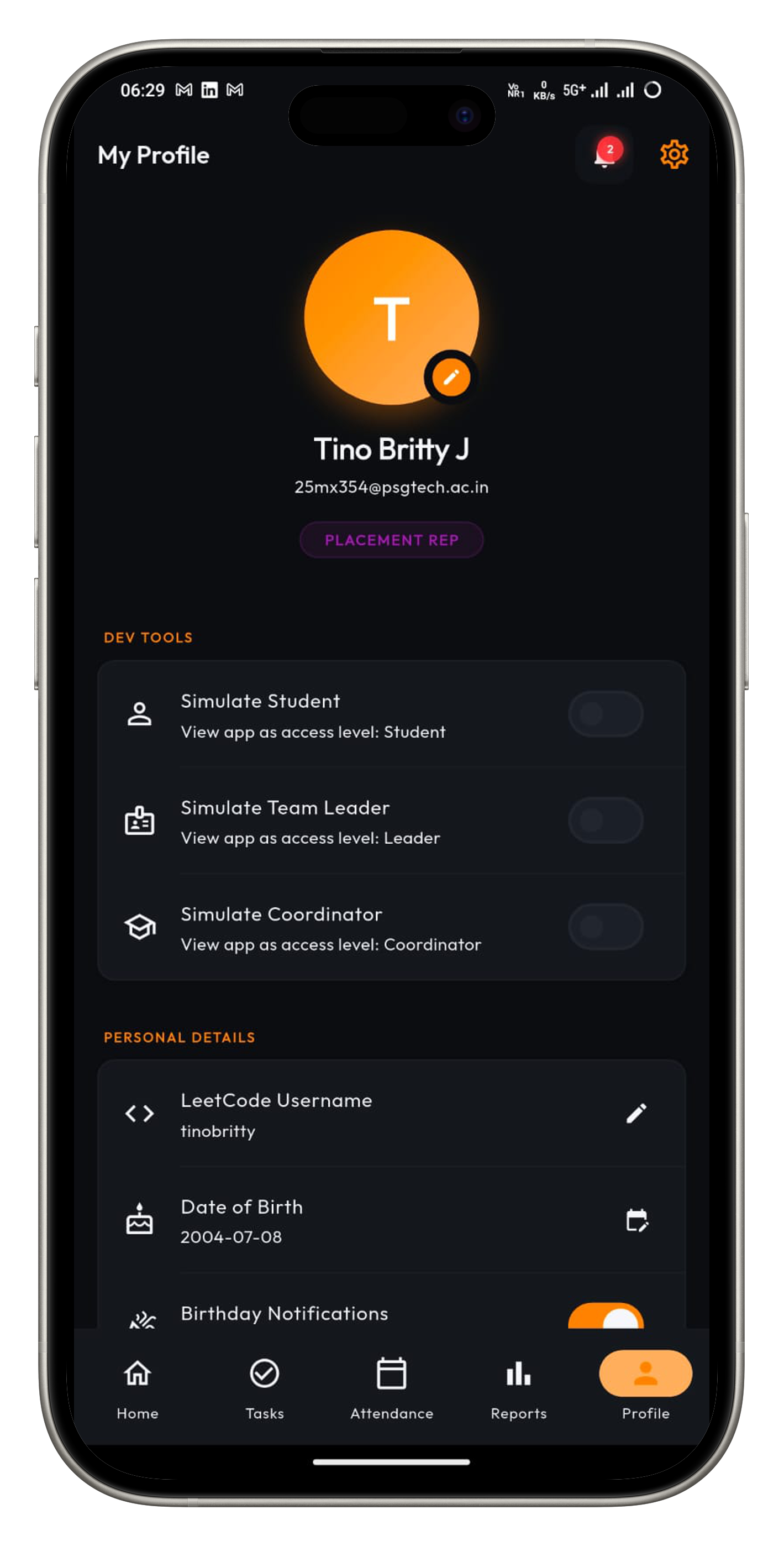 | Role | What They Can Do | |------|-----------------| | Student | View their own attendance, tasks, announcements, and LeetCode stats | | Team Leader | Mark attendance for their assigned team (5-6 students each) | | Coordinator | Access reports and assist with administrative tasks | | Placement Rep | Full access—create announcements, manage tasks, view all data |